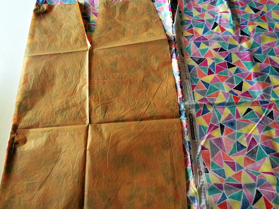 Lo primero que hacemos es doblar la tela y poner encima el patron, lo marcamos con una tiza de tela.