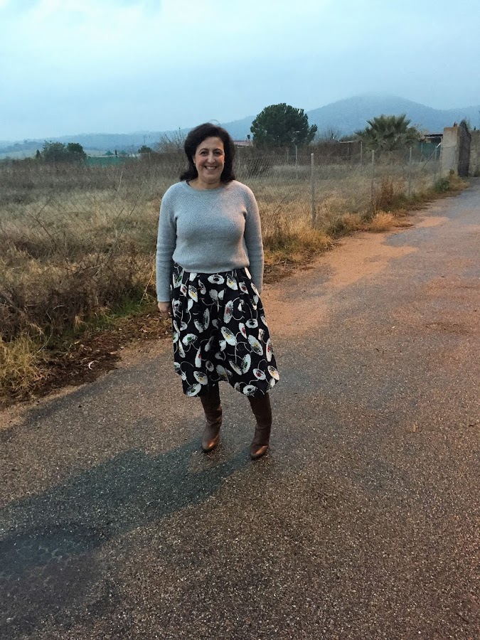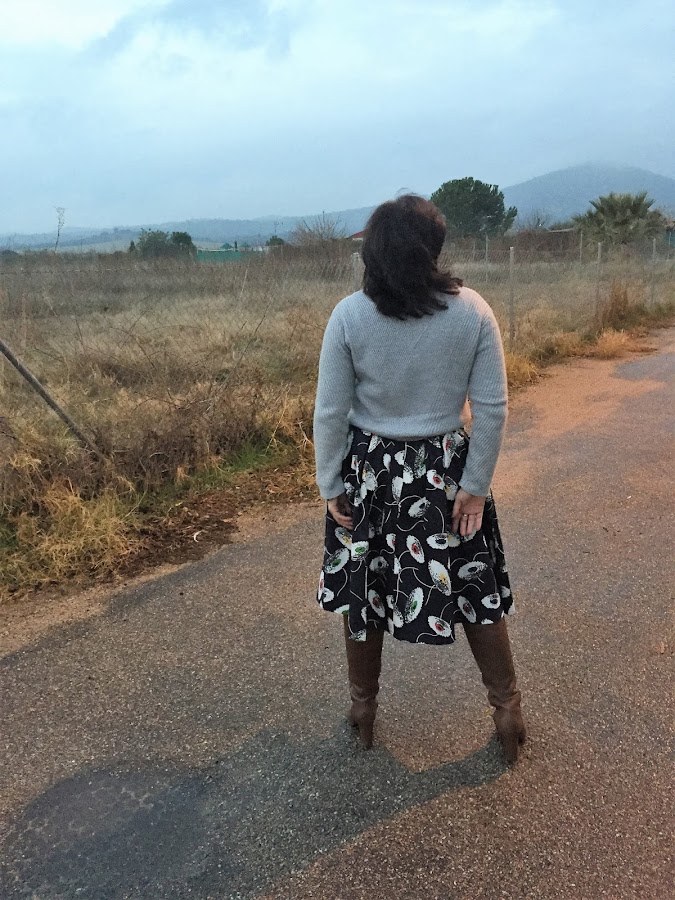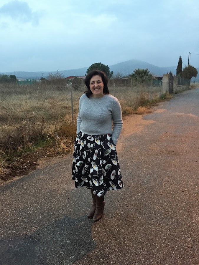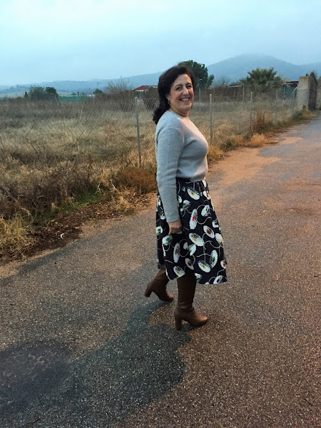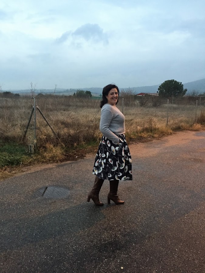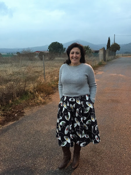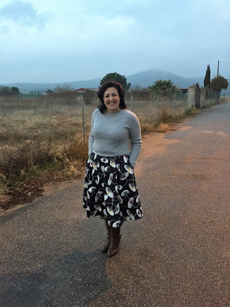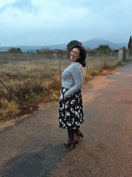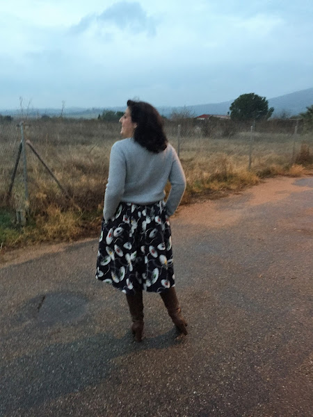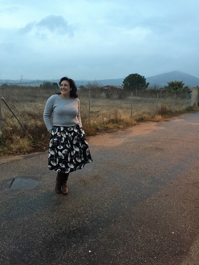 La falda es una falda de largo midi, con bolsillos en los laterales y unos pliegues y cremallera en la espalda. La cinturilla es de color rojo, pensé que el contraste estaría bien. Os dejo unas fotos de la falda tal y como yo me la imagine cuando vi la tela, a ver que os parece el resultado.