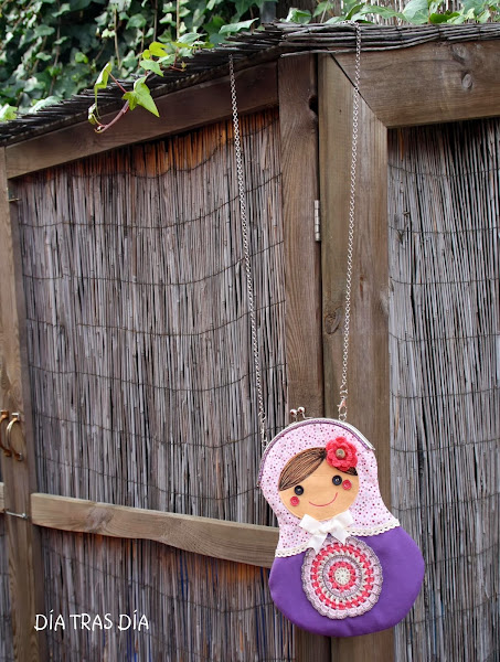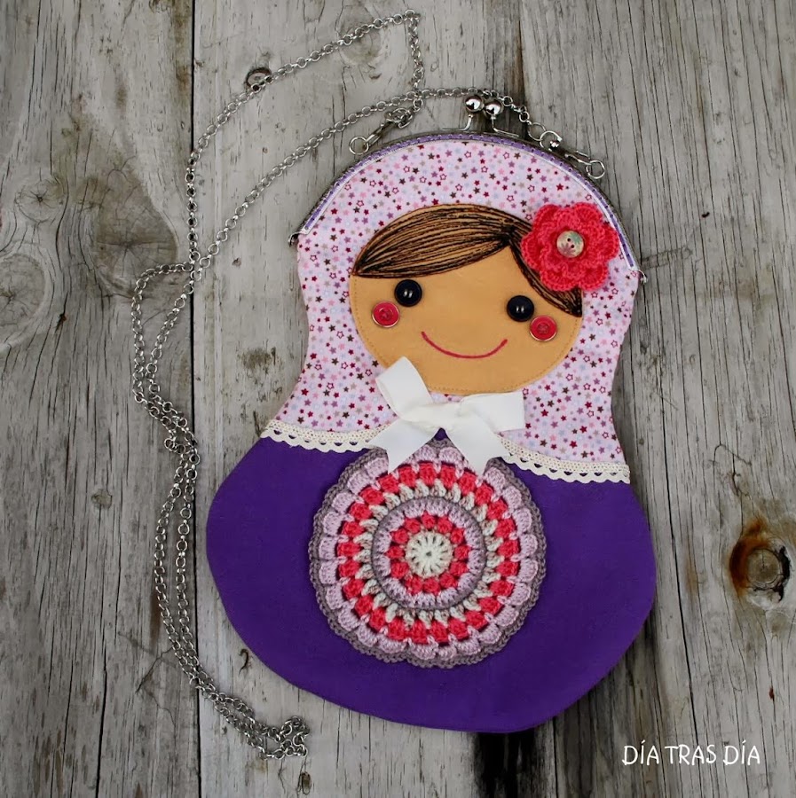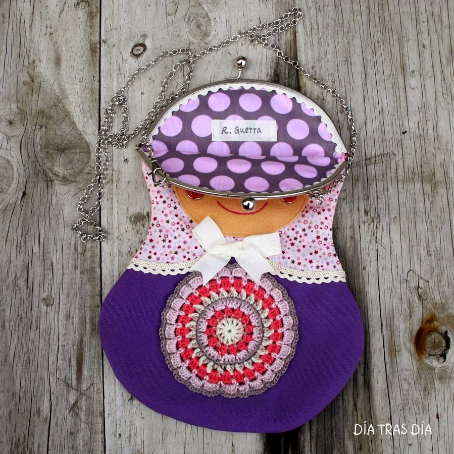 Hace algunas semanas, después de que yo enseñase alguno de los últimos bolsos que había hecho, volvió a ponerse en contacto conmigo para interesarse por los bolsos Matrioska. Y el requisito era que fuese en tonos rosas y morados y que llevase en la barriga detalle de rosetón de crochet.
