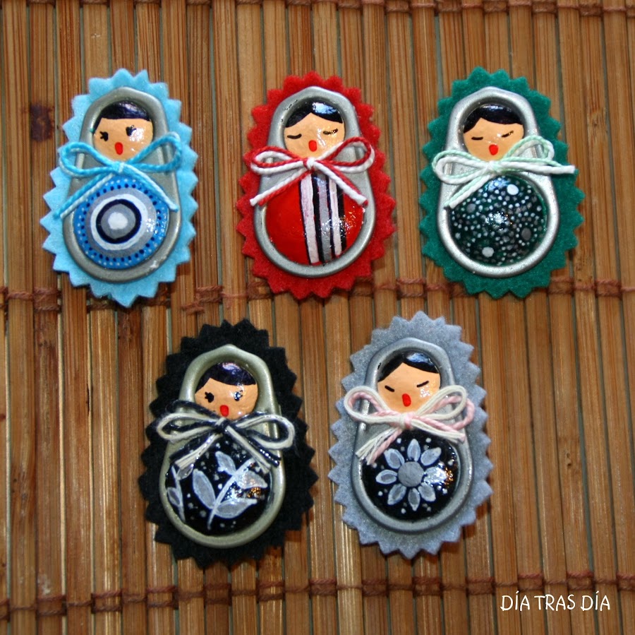 Me dijo que su idea era algo un poquito más grande de tamaño y que si podía hacerle una Matrioska en fieltro, del tipo de las que llevan mis camisetas. Y así fue como salió este otro modelo de broche Matrioska: