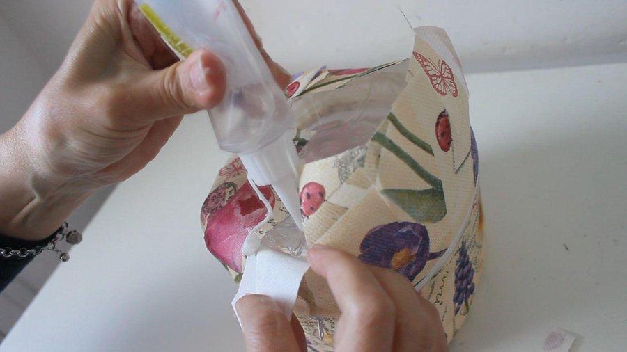 Para pegar la servilleta o la tela podemos utilizar silicona fría o algún pegamento universal. Si sobrara un poco al unir los dos extremos podemos recortar el excedente con la tijera.