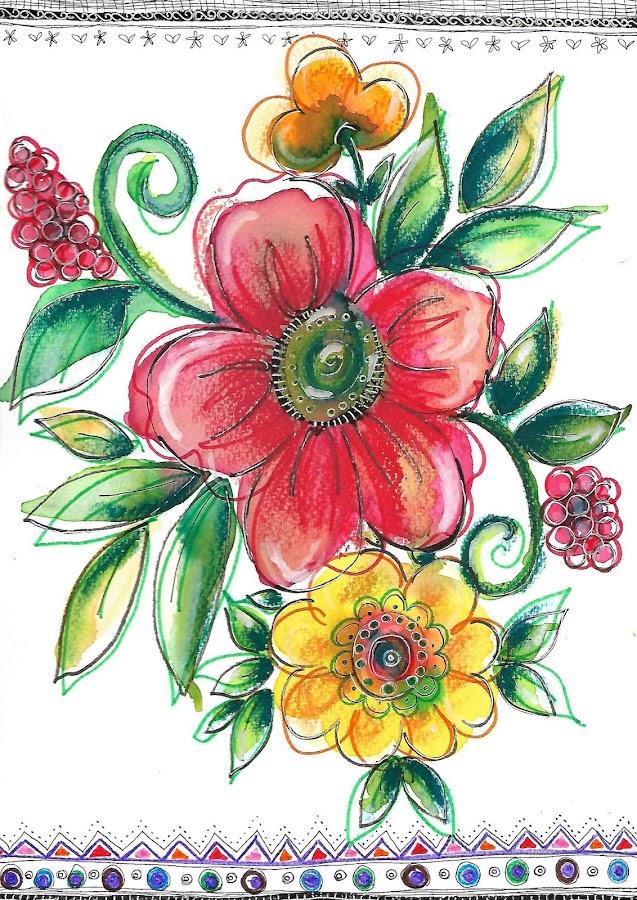 This Sunday we want to share with you a very expressive drawingof a red flower, with folk ornaments. We have done it, playing with liquid watercolours, watercolour wax crayons, colour markers and black and whitefine tip markers.