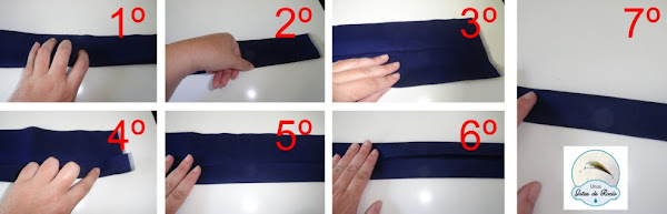 Lo primero que hacemos en doblar la tela por la mitad a todo lo largo, señalar el doblez con la uña (o la plancha), luego abrimos y doblamos la mitad de abajo a su vez por su mitad, señalamos y hacemos lo mismo con la mitad de arriba. Por último doblamos de nuevo por la primera señal que marcamos. Ea, ya tenemos un asa de 3 cm. de ancho. Ahora vamos a coserla.