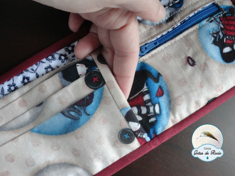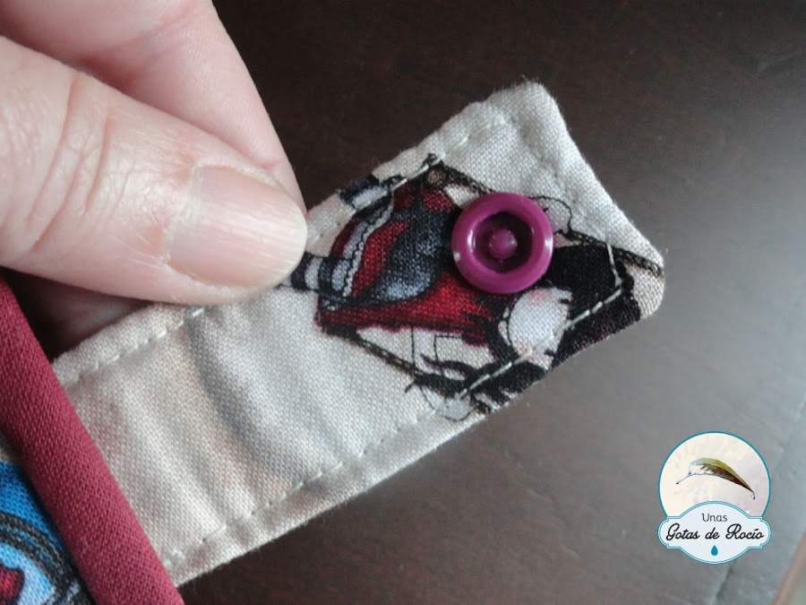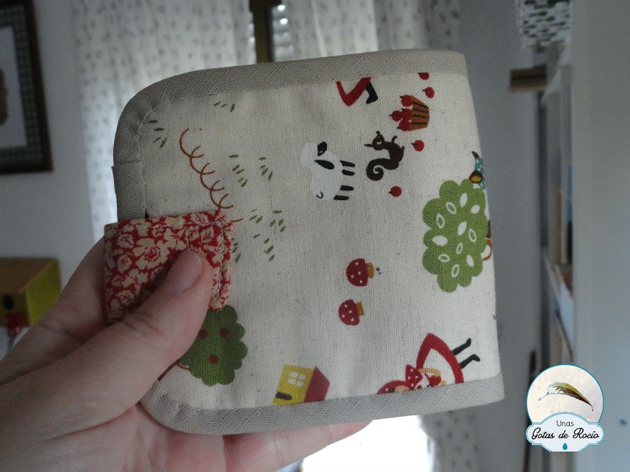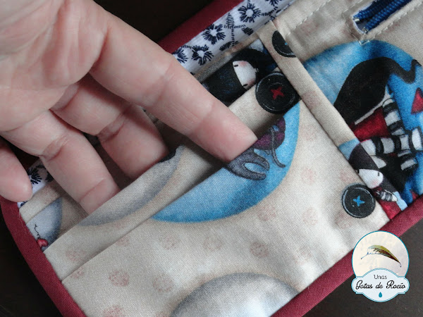 Antes de hacerle a Mar la suya, practiqué con otra carterita que me he quedado yo. Quería ir segura, pues me quedaba la tela justa. Y preferí no arriesgar. ¿Adivináis qué tela elegí?