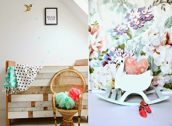 Lo primero que llama la atención de esta habitación infantil es el mural de flores que adorna una de sus paredes, que no está pintado sino que forma parte de un mural de papel. Sin duda la forma más rápida y fácil de conseguir este bonito efecto.