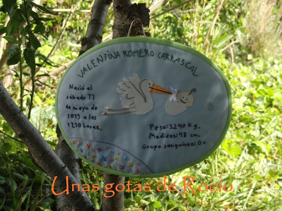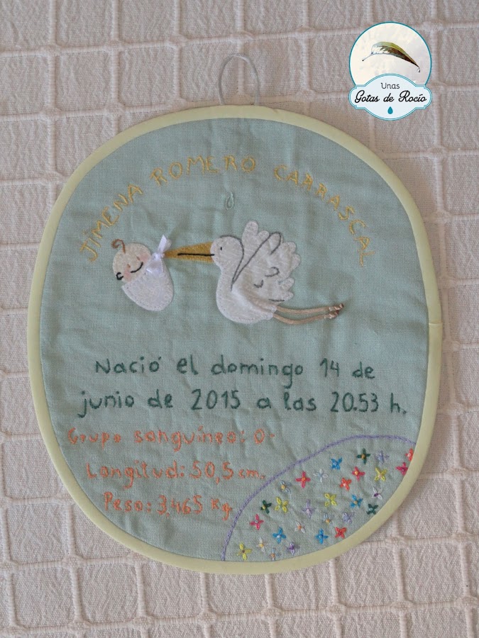 Lo quería igual que el de su primera nieta, pero diferente. Así que le propuse algunos pequeños cambios: la forma del cuadrito y la dirección en la que vuela la cigüeña. El color de la tela lo escogió la mami. El planeta de flores lo hemos conservado, pues las hermanas van a compartir la habitación.