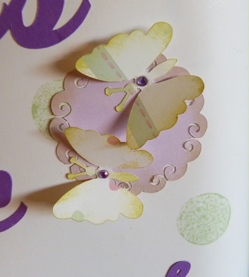 Las letras, las mariposas y el scallop estan cortados con la craft y entintados con disstres.