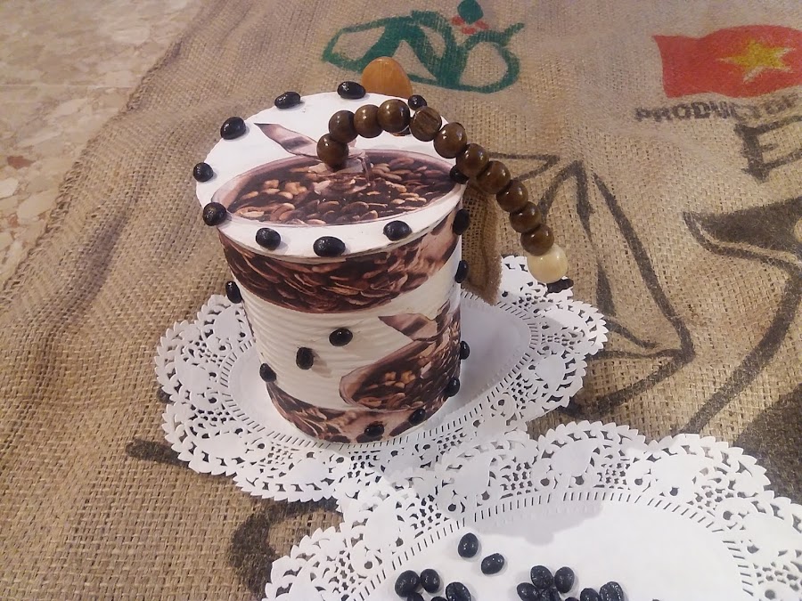 Hola Chic@s, que bien, otra vez estamos juntas en el Reto Mensual Blogueras, que este mes , Lola de El Refugio de Lirtea, nos propuso como tema para este mes de Abril "Café o Té", . Al principio, mis mussas estaban cayaditas, y veía que no podría hacer nada, pero una mañana, una de ellas me dijo, vamos!!!! coje una lata, de las que tiras a la basura después de vaciar su contenído, y pintala de blanco. Me gustó la idea de reciclar y cuando me dijo : pintar de blanco, mis ojos se abrieron, como búhos en la noche. Soy feliz pintando de blanco!!!Tenía una servilleta precisamente de tazas de café, molinillos y con ella pude decorar la lata con decoupaje. Otra de mis mussas, me aconsejó, hacer un saquito lleno de granitos de café y me serviría ,como ambientador natural. Una cucharita de madera,con un terron de azúcar, y ya está.Sii, ya hemos terminado, dijo la tercera..... hasta ese momento había estado muy cayadita. Y si hacemos una tapa , con un circulo de cartón pintado en blanco y decorado igual que la lata??Dicho y hecho!!!Tachaaaaannnnnnnn!!!!