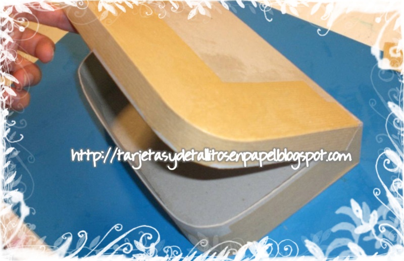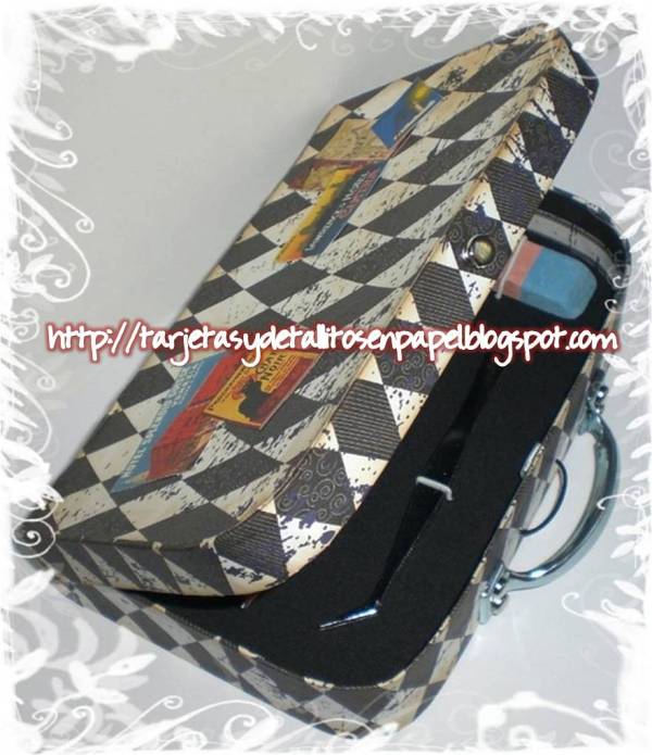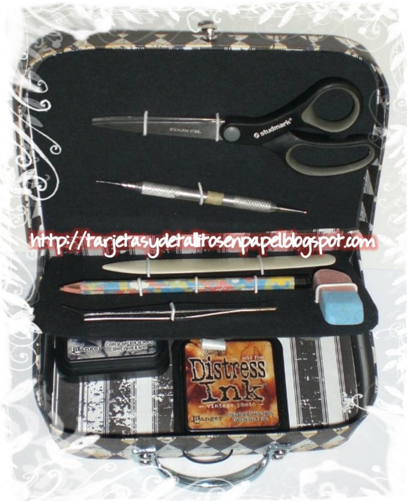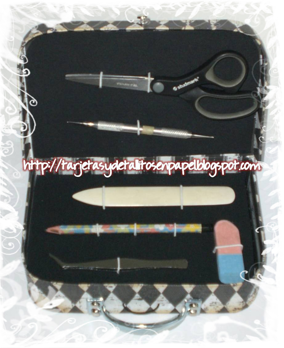 Una vista general de la caja abierta y con mis implementos de trabajo. En la tapa interna he colocado una base en tela negra para colocar mi tijera y el punchón.