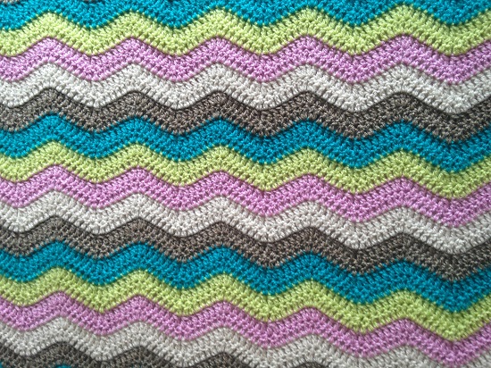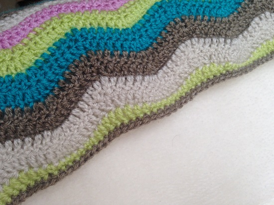 Como remate le hice un borde sencillo, rellenando los huecos que hacía el zig zag con el tono verde del resto de la manta, más una fina línea marrón, recogiéndola en su totalidad.