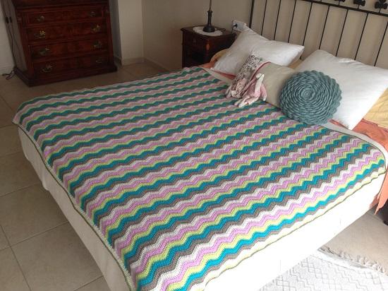 Como la he tejido tan deprisa, no fue hasta el final, cuando la puse sobre mi cama para fotografiarla, que me di cuenta de que es realmente bonita, una "señora manta". Junto con ella le escribí una carta de agradecimiento por los años compartidos, pero eso queda para ella...
