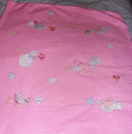 Esta tela la escogió uno de sus hermanos, porque era rosa y calentita (acabábamos de saber que iba a ser niña), y aquel día, aunque no entraba en mis cálculos hacer más mantas, no me quedó más remedio que comprarla, porque además, él no estaba muy convencido de las ventajas de tener más hermanos...