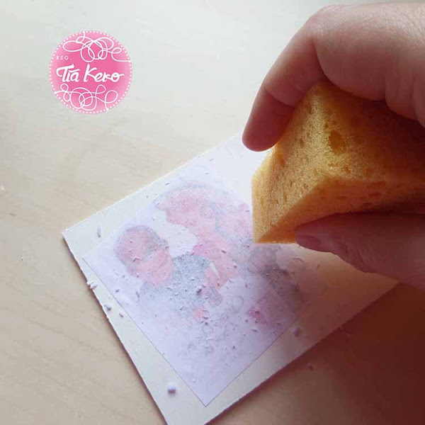 Una vez esta seco, con una esponja blanda y un poco de agua vamos quitando el papel sobrante, hasta que veamos que el dibujo comienza a aparecer. Cuando ya el dibujo ha salido, vamos a continuar con el dedo que es más fácil quitar el papel sin llevarnos todo el dibujo.