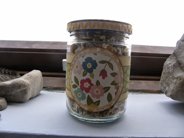 Entre trabajos que por el momento son secretos..... se me ocurrió tunear un bote con una manzanilla buenisima que me regalaron en verano, esta hecha con recortes de papel de una forma muy sencilla, una banda con unos círculos troquelados y círculos en la tapa , para el perímetro de la tapa una piculina pegadita y esta!!!