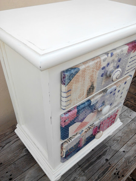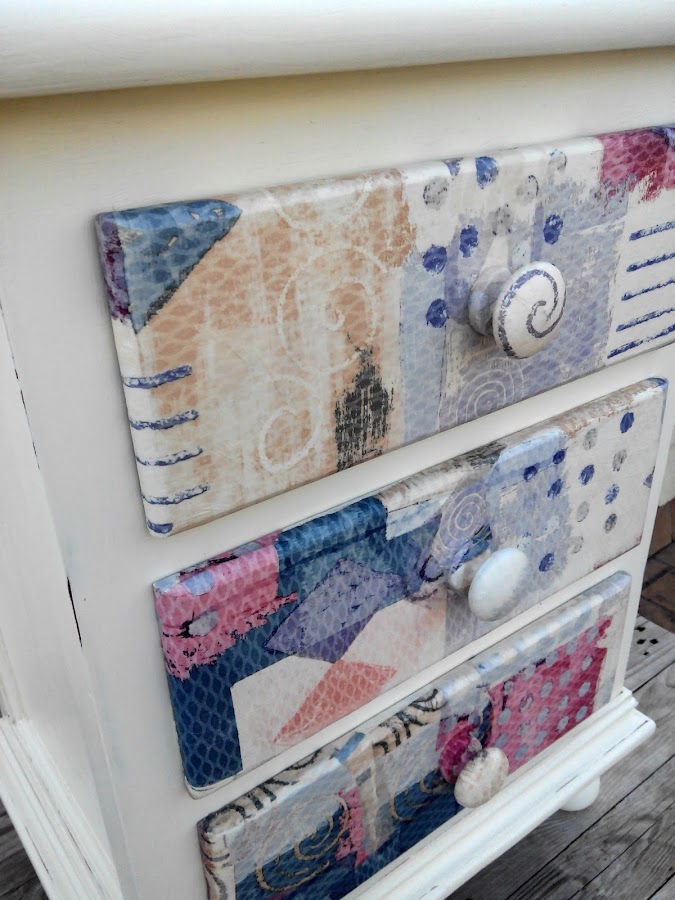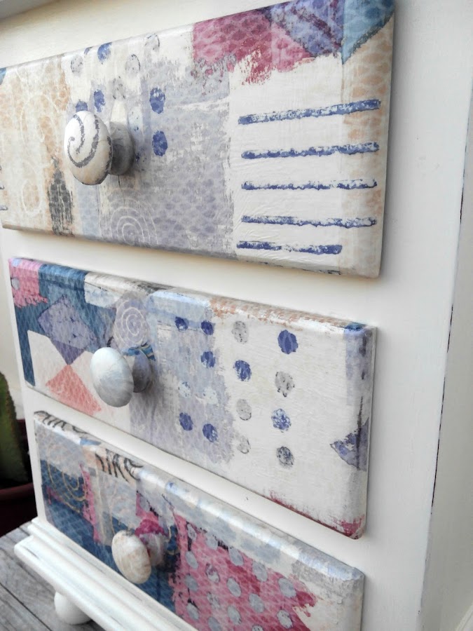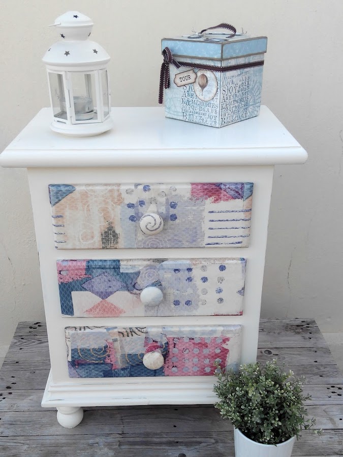 Para poner el papel, seguí los mismos pasos que para tunear la silla de Ikea para la tienda de mi amiga Carmen. Con la cola Stylpatch que a la vez que pega, también barniza y protege el trabajo frente al agua, el calor, el frío..., voy pegando trozos de papel que he rasgado con las manos previamente. Podéis pinchar el enlace para ver más.