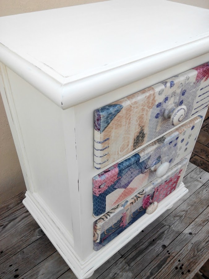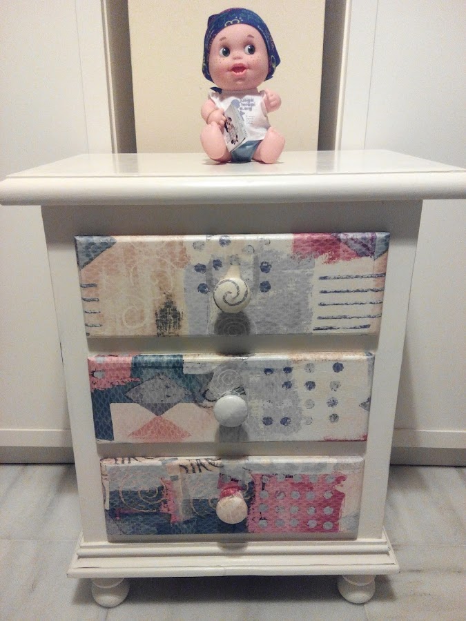 Mi amiga María me hizo este encargo: tunear esta mesita de noche provenzal rescatada de la casa de sus padres, en color blanco y con algunos motivos en color, para la habitación de su hija Carlota.