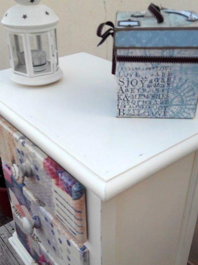 Está pintada con pintura a la tiza color blanco roto, sólo ligeramente decapada en algunos filos, para que conservara ese aire un pelín retro y luego tiene capas y capas de cera. Ya domino la técnica de "dar cera, pulir cera" del maestro Miyagui de Karate Kid. Jjjjjjjj...