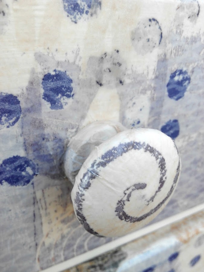 Decidí integrarlos en el trabajo y forrarlos con el mismo papel y la verdad es que me ha gustado muchísimo el resultado final. Aunque el papel queda más arrugadito por la propia forma del tirador, una vez seco, le pasé una lija muy suave, solo para quitarle las aristas que forman las arrugas secas, y quedó perfecto.
