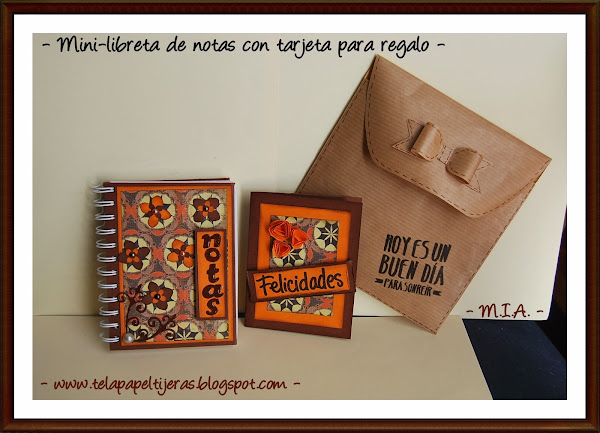 Una mini libreta de notas con una tarjeta a juego y metida en un sobre casero de papel kraf... Los paples son de una colección de My Mind"s Eye, combinado con naranja... una mezcla no muy de mi estilo pero que me ha gustado mucho trabajar...
