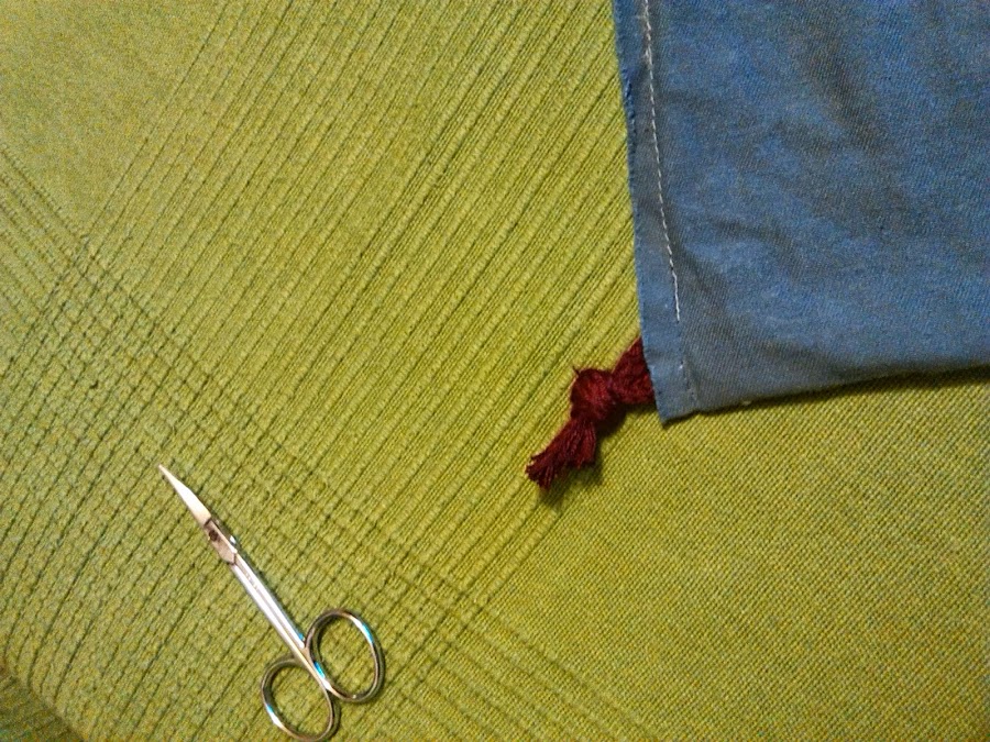 Le damos la vuelta a la bolsita, y con una tijera descosemos un poco la costura en el extremo inferior, dejando un agujero para meter los extremos.