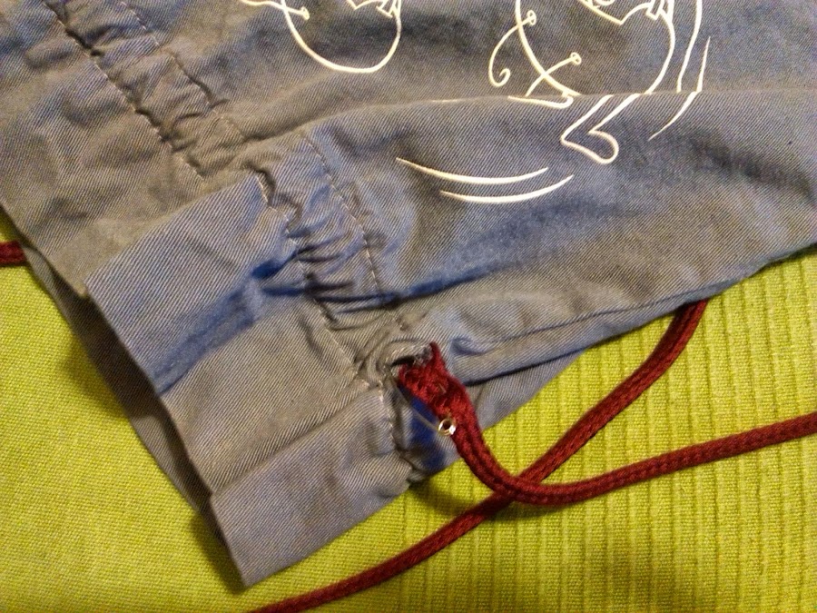 Primero preparamos los cordones de las asas, para ello yo use dos cordones de 1,5m cada uno. Quitamos el Cordón de cierre de la mochila, y con un imperdible metemos el cordón por la aberturas superiores de la mochila, una por cada lado.