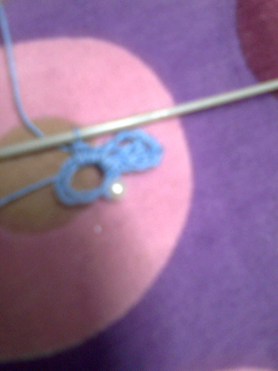 2nd row : ( in the two chain space with bead made): 3ch(to be count as DC) 3dc, 1ch, insert bead, 1ch, 4dc, turn