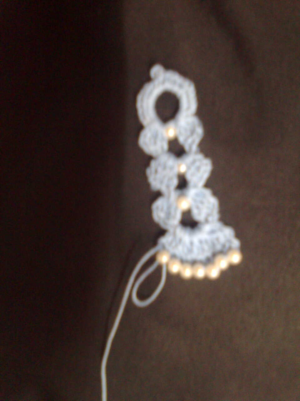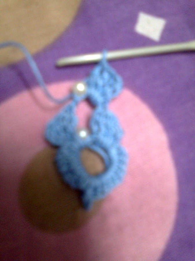 1st row: 3ch(to b count as dc), 2dc, 3ch,make slst in ring, 1ch,9sc, slst, 3ch insert earwire make picot with slst in first ch, sl st, 1ch, 9sc, 4dc, 1ch, insert bead, 1 ch, slst on 3rd ch (in3ch made at beginning), turn