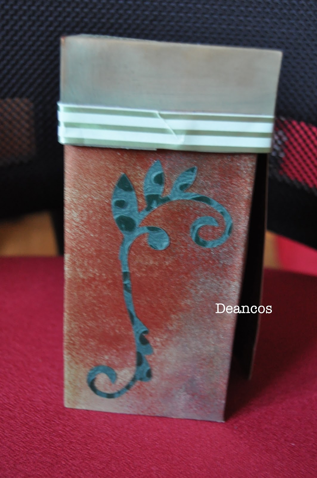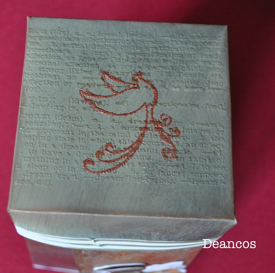 En la tapa utilicé dos embosados: uno con un sello de texto con polvos transparentes y sobre él otro de un pájaro embosado con polvos color cobre. En el borde adherí una cinta decorativa made in China con cinta de doble cara. Algo así como una washi tape casera.