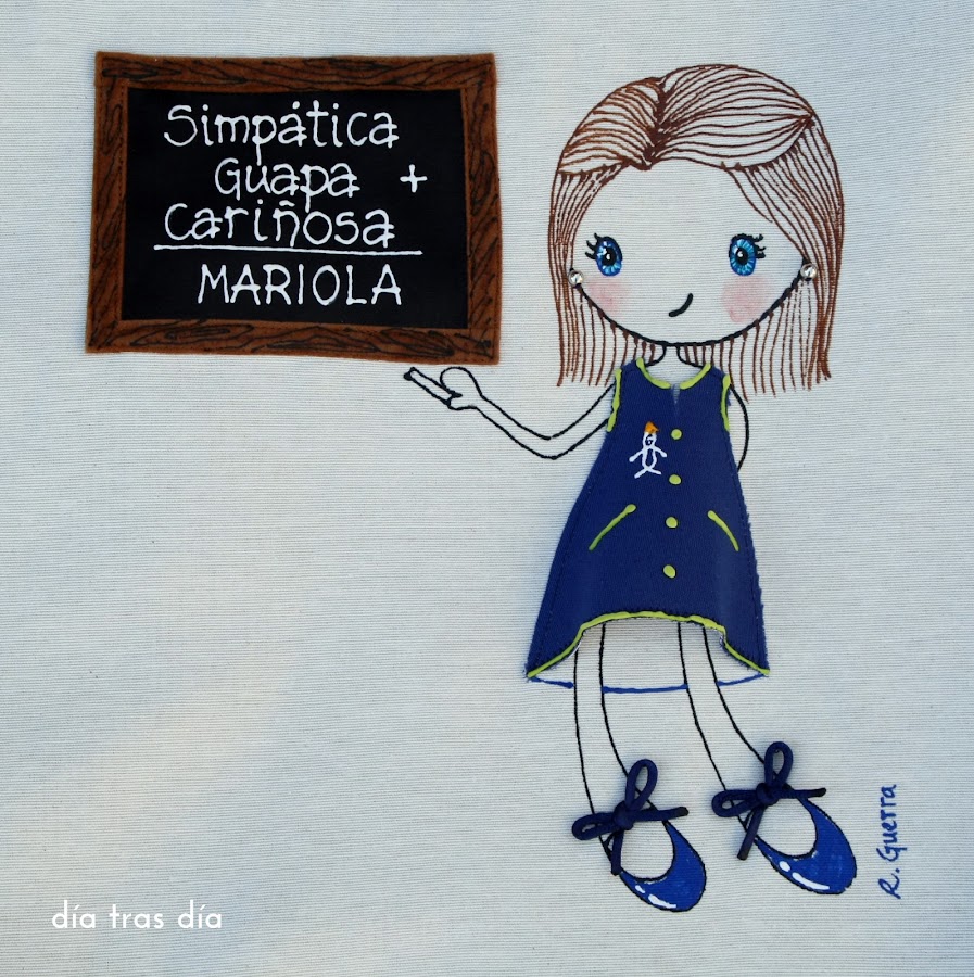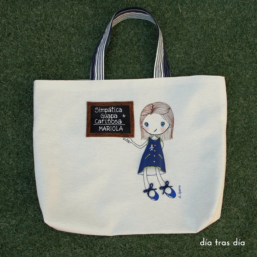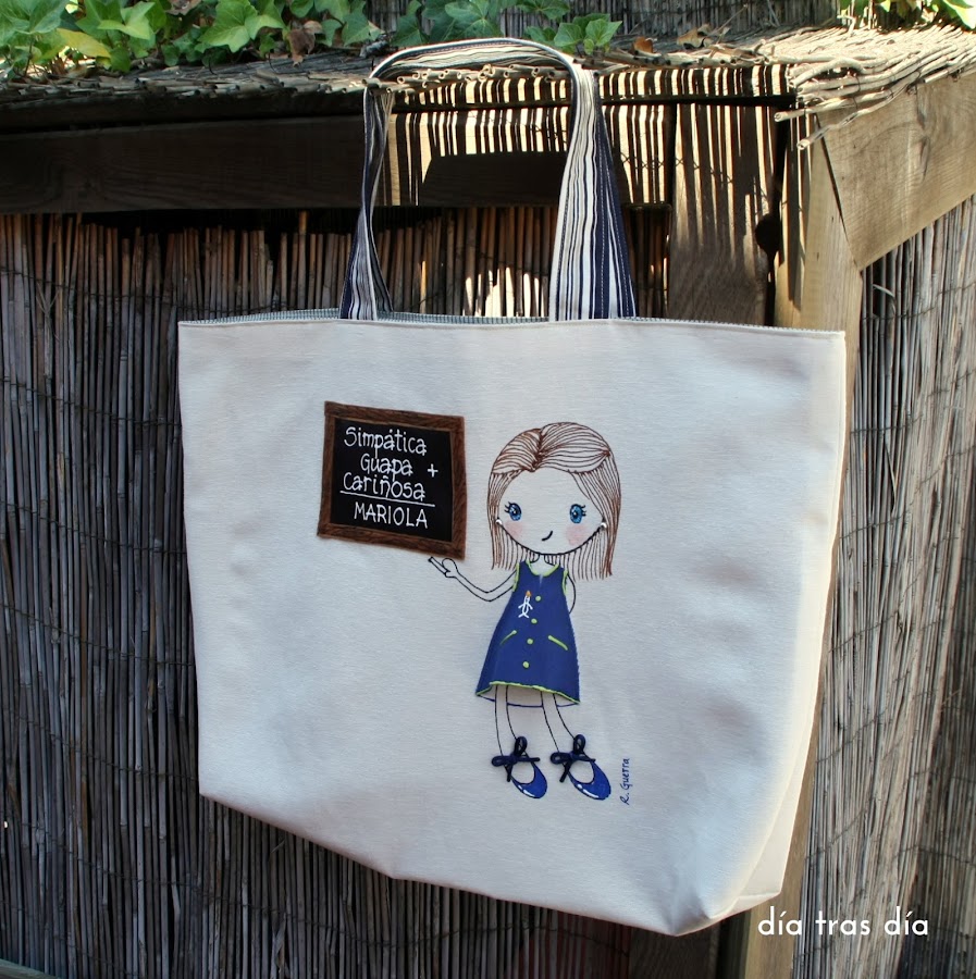 Tras ver esta bolsa, Carmen Lucía se puso en contacto conmigo para pedirme una bolsa de playa, pero personalizada para su destinataria. Me envió foto de la seño para que pudiera sacar sus rasgos principales y el modelo de baby que suele llevar.