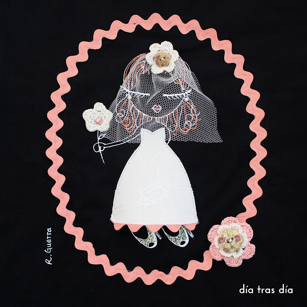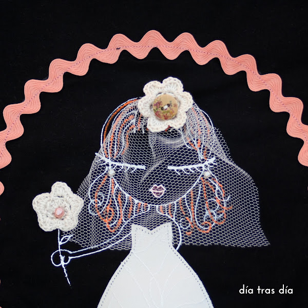 Entre las distintas camisetas de novia que he hecho, a ella le gustó una que hice con la novia con su pelo suelto con toques de color anaranjado y rodeada por un círculo de cinta de piquillo en color salmón.