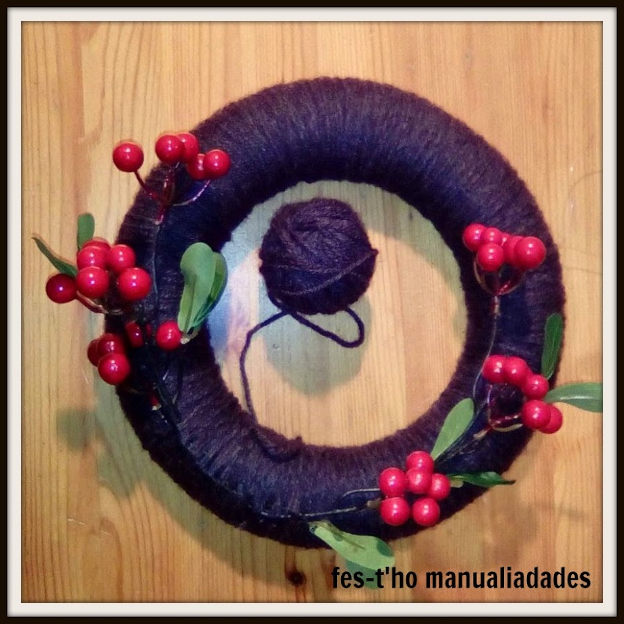 Envolvemos el aro de porexpan con la lana, metiendo entre medio las ramitas con las bolas, para que queden bien prietas. Lo mejor es darle un par de vueltas para que quedara tupido y fuerte.