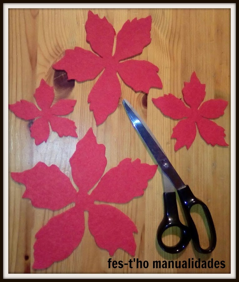 Calcamos las plantillas de la flor de navidad sobre el fieltro. Las hojas en verde y la flor en rojo. Para la flor he utilizado 4 "flores" y las he puesto de más grande a más pequeña, haciendo pequeños pellizcos en el centro de cada hoja. Todo ello pegado con silicona caliente.