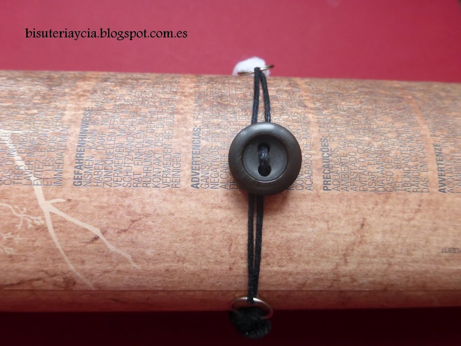 Por último haremos el cierro, para ello pasaremos el cordón encerado por las anillas, colocaremos el botón y anudaremos el hilo procurando que el nudo nos quede por debajo del botón, así no se ve y queda mas pulido nuestro trabajo.