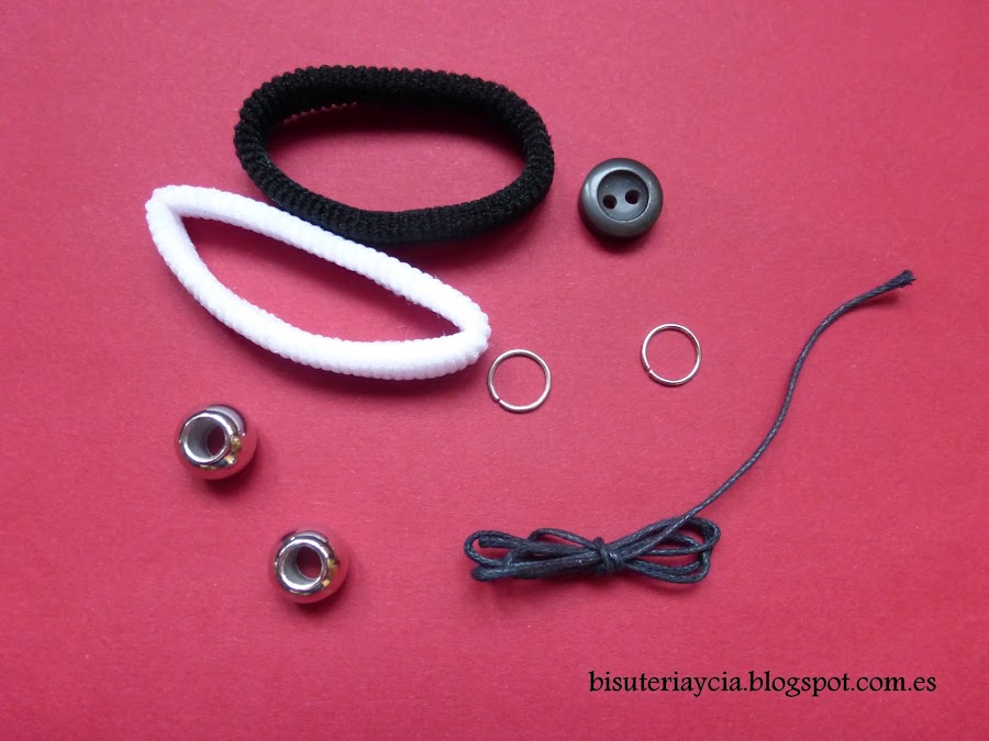 Paso dos, enfilaremos los abalorio a ambos lados del nudo y colocaremos una anilla al final de cada goma.