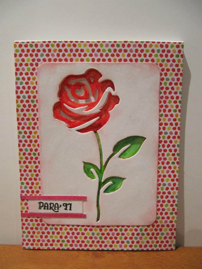 Mi trabajo es una tarjeta, he utilizado el troquel de una rosa de Sizzix, el troquel en si lo he utilizado en el interior de la tarjeta justamente donde esta el corte del troquel por lo que se ve la rosa sin abrir la tarjeta