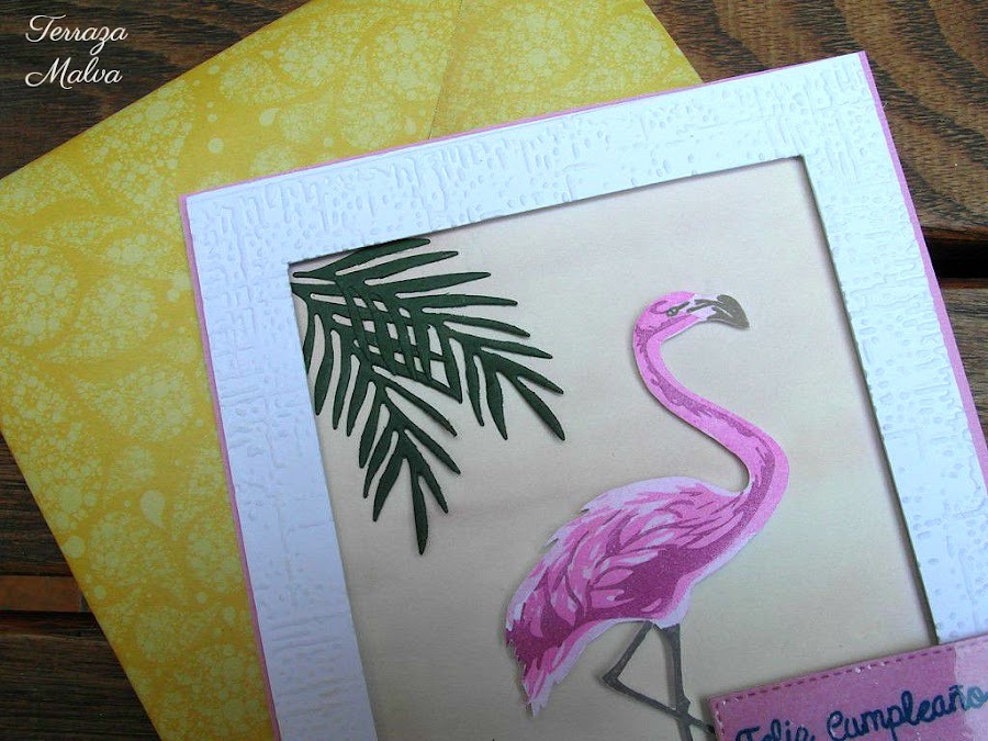 Para los sellos por capas del flamenco y la flor de hibiscus he utilizado tintas de tipo chalk que cubren muy bien y dan un efecto que me gusta mucho.