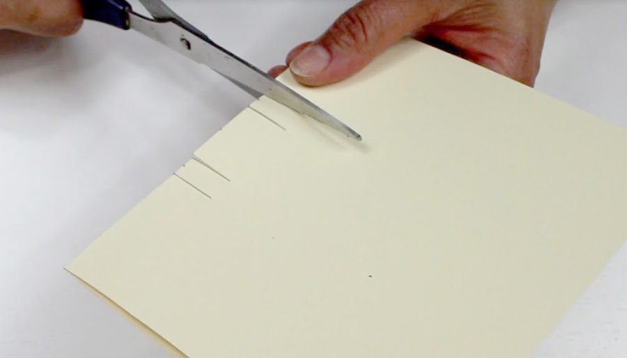 * Lo primero será cortar las pestañitas en las que pegaremos la cesta, para que de sensación de 3D * Vamo a hacer 2 pestañas, de 2 cm de largo, en el centro de la tarjeta, a 1 cm del medio cada una.
