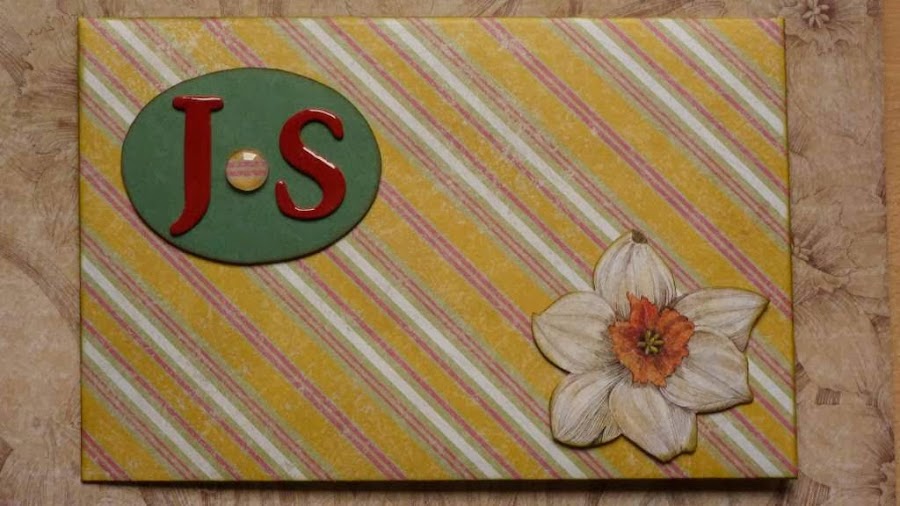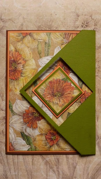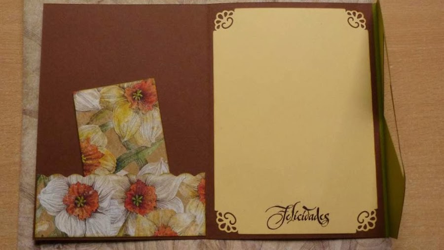 Usé una base de cartulina marrón, y sobre ésta, cartulina naranja que enmarca el papel de flores. Como detalle central, saqué una de las flores que enmarqué en verde y naranja, y la sopala verde está hecha con cartulina con textura. Al poner ésta solapa, se me ocurrió otra forma de colocarla, pero ya estaba pegada. Son cosas que pasan sobre la marcha. Lo aplicaré en la próxima.