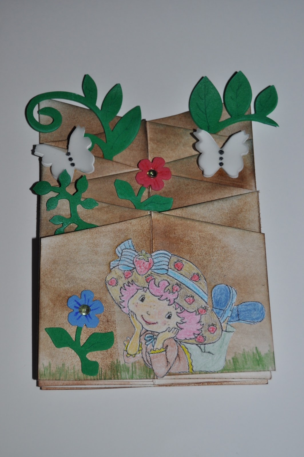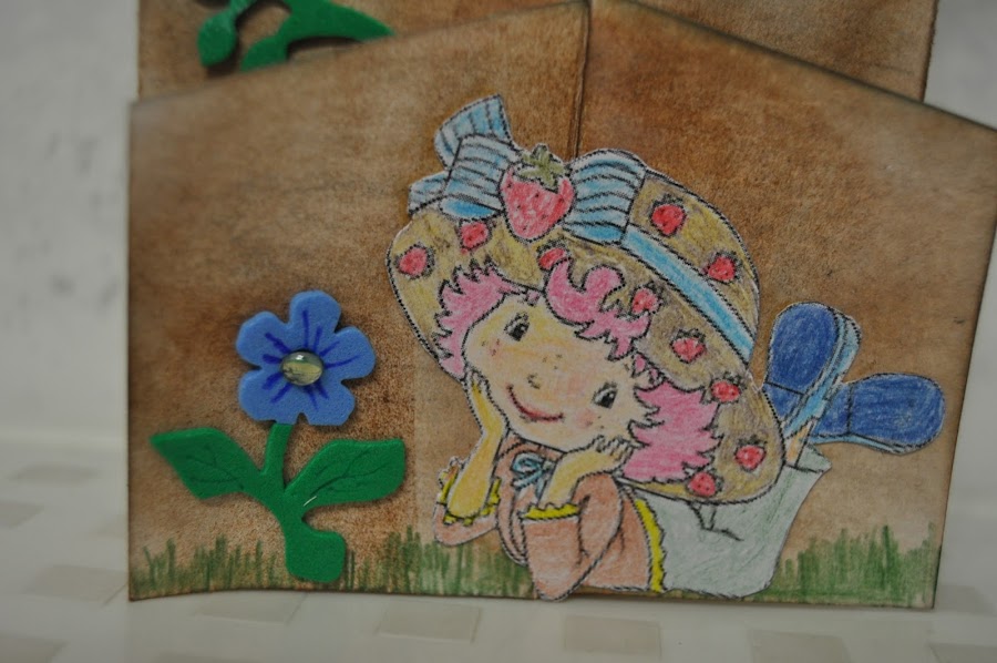 En la parte de abajo, pegué una muñeca "fresita", en una postura muy simpática, que coloreé con las acuarelables.