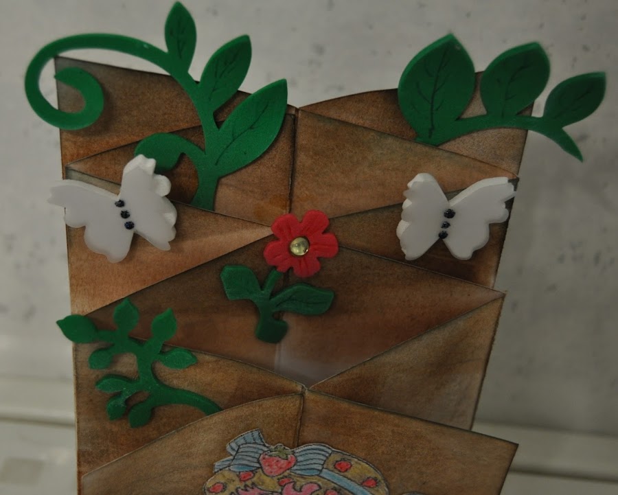 La tarjeta asemeja un paisaje en perspectiva, así que en cada "escalón" del paisaje, fui poniendo flores, hojas y mariposas de goma eva porque quería que tuviera volumen. Las mariposas de goma eva tienen un papel vegetal por encima con unos toques de liquid pearl azul.