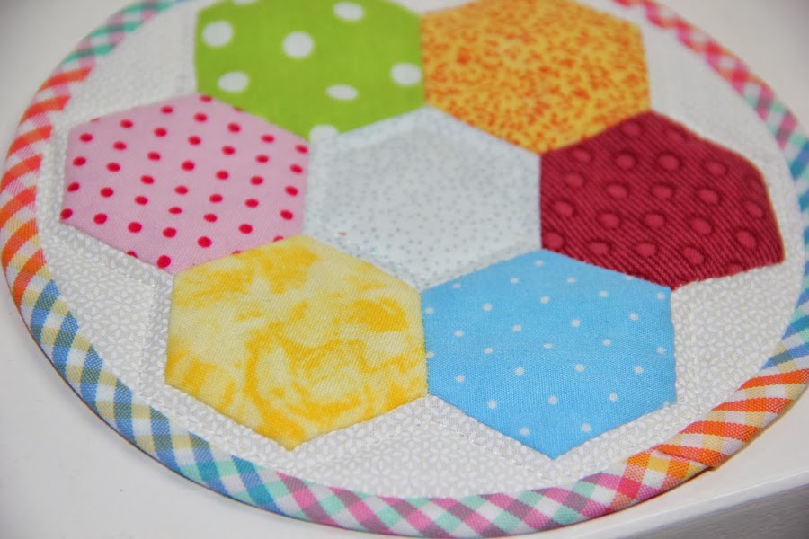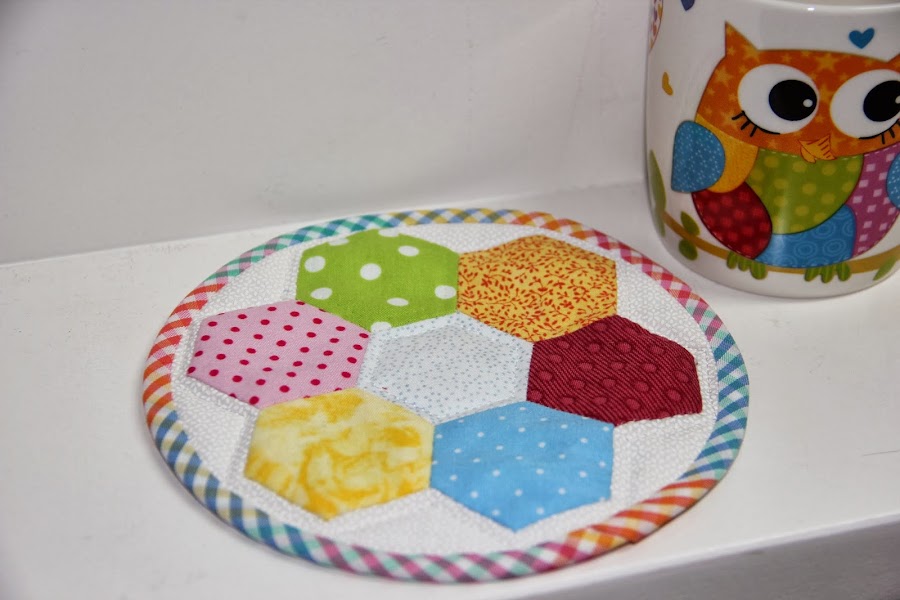 Para hacer el posavasos intenté utilizar los mismos colores que la taza y da la casualidad que tenía en casa un biés multicolor que ha quedado genial para poner alrededor.