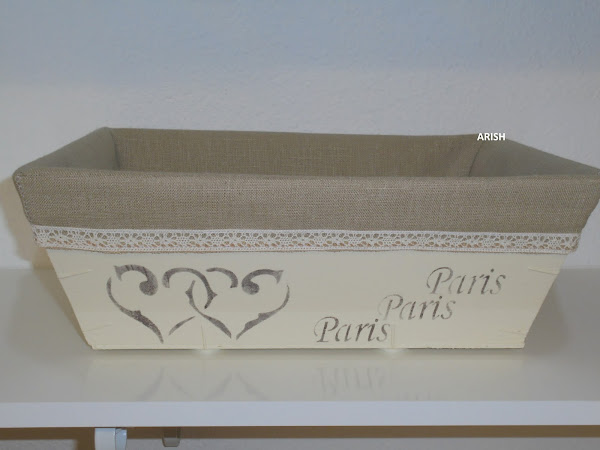 una la he decorado con mariposa y una escritura en francés para el baño y como todavía guardaba la tela que me sobró de el conjunto de bolsa y corazón que hice en 2012 me ha servido para forrarla y ahora mi conjunto de baño está más que completo