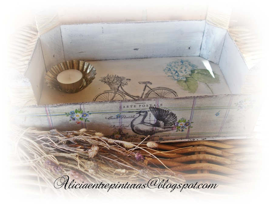 Esta cajita andaba dando "tumbos" de un sitio para otro.... y es que a mi las cosas pequeñitas no se me dan nada de bien decorarlas.... y de pronto me vino la inspiración. Nunca había decorado con rayas y siempre me han gustado los trabajos que he visto, así que .... unas rayitas en gris, fondo blanco y un transfer en la tapa, cera blanca y ¡listo¡