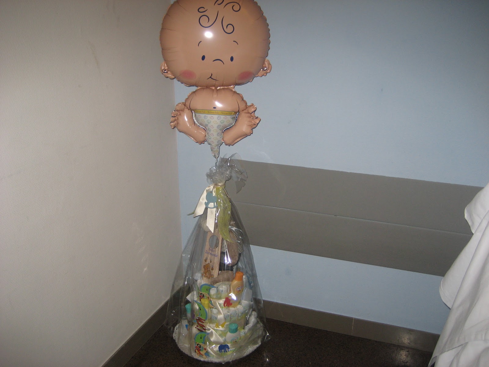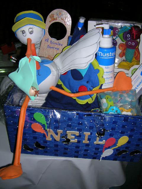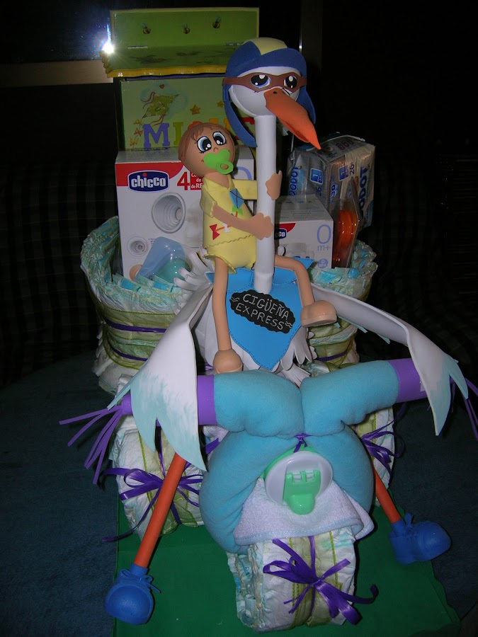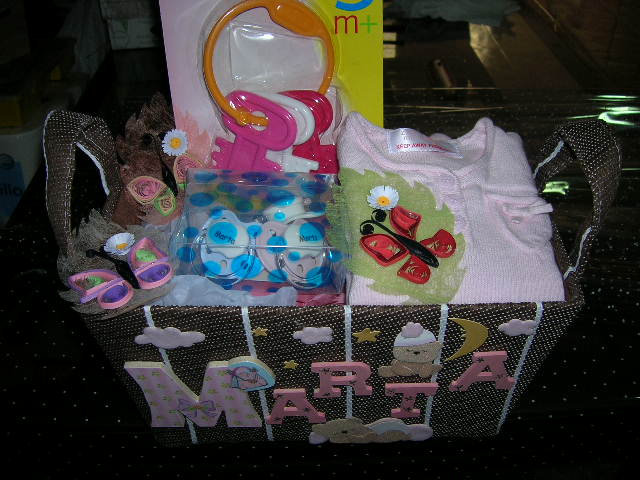 en esta cesta aparte de personalizarla le añadi una fofu cigüeña por no poner el