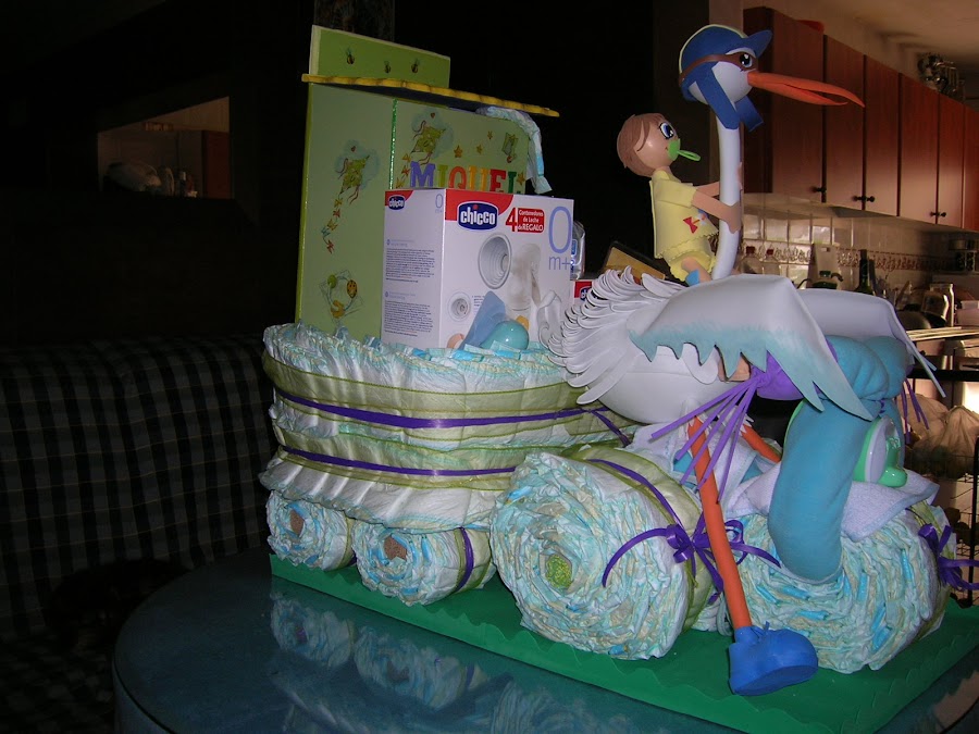 Esta la realice para mi hermana un triciclo con remolque el cual iba repleto de regalos y como no habia que elegir un conductor especial en este caso fue una cigüena con un bebe al cuello