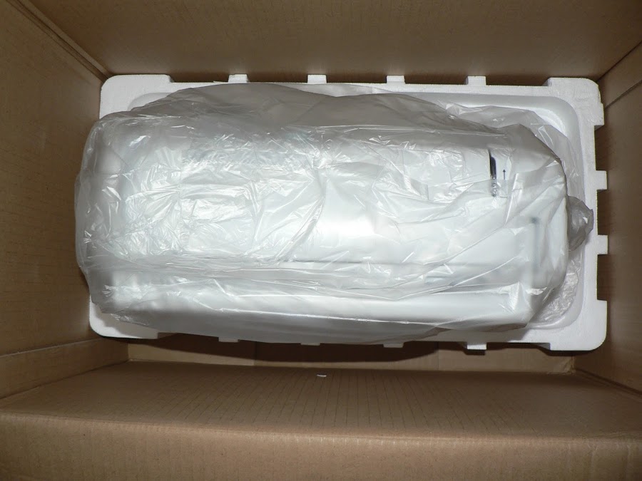 Al abrirla y sacar la tapa protectora de porexpan, te encuentras con la máquina envuelta en plástico y con la tapa puesta.