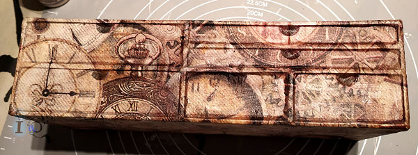 Luego hago decoupage con un papel de arroz de relojes y engranajes. El papel es suficientemente grande para envolver toda la cajonera. Lo pongo con los cajones puestos y cerrados.