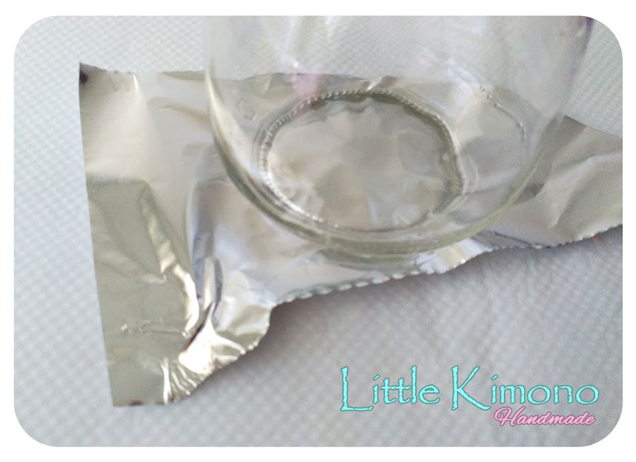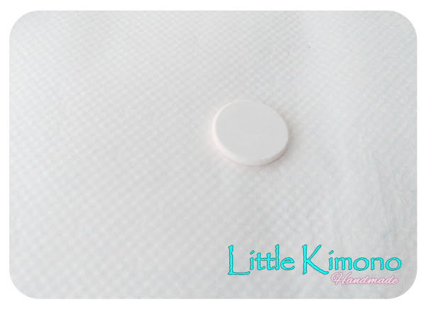 1. Primero colocamos un trozo de papel de hornear para que las piezas no se peguen al área de trabajo ;) Hacemos una bolita con el fimo blanco, colocamos el papel aluminio encima y con la base del vaso aplastamos lentamente para que los bordes del fimo no se rompan y reservamos esa pieza.