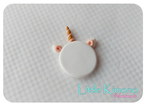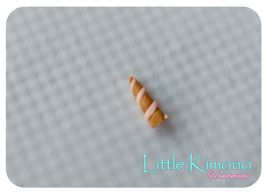 3. Seguimos con la última pieza, el cuerno de nuestro unicornio, hacemos una especie de cono con masa color oro y con el mismo rosita de antes una especie de "fideo" que enrollaremos alrededor del cono color oro, como muestra la imagen ;)