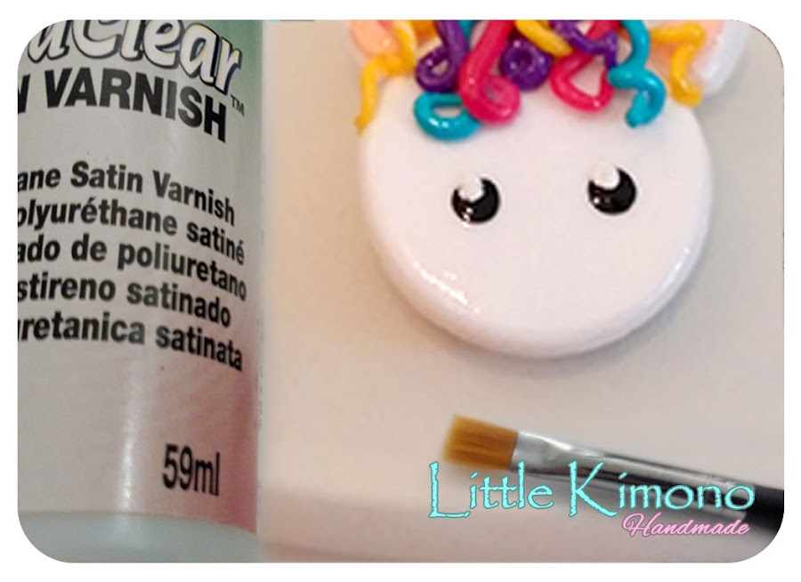 8. Dejamos secar completamente y aplicamos una capa de barniz para proteger la pieza. Como os comenté en el DIY del muerciélago Kawaii podéis agregar purpurina después de una pincelada de barniz para darle un efecto especial ;)
